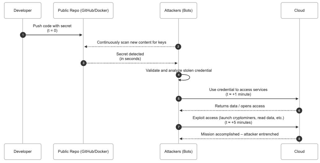 To visualize just how rapid the exploit timeline can be on a popular platform, consider the sequence below. A developer accidentally commits a secret, and within minutes automated bots have found it, attackers have begun abusing cloud resources, and your environment is under siege: