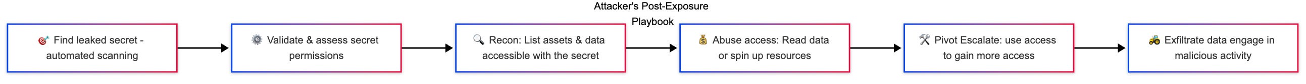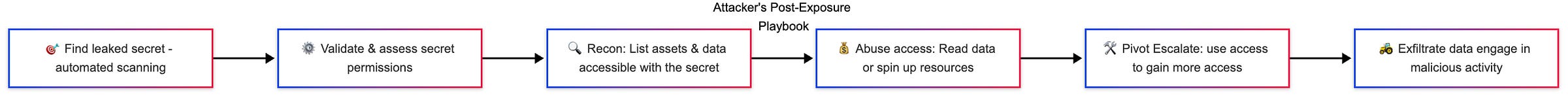 Let’s summarize an attacker’s typical playbook after finding a leaked secret, in a simple flow: